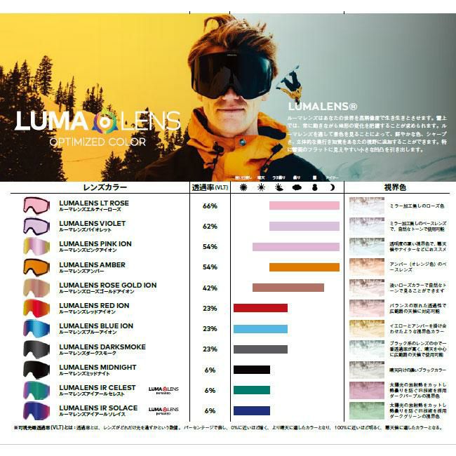 視野200度を誇るPANOTECHレンズや、雪山での凹凸を鮮明に映し出すLUMALENS(ルーマレンズ)は、プロライダーからも高い評価を受けています。
