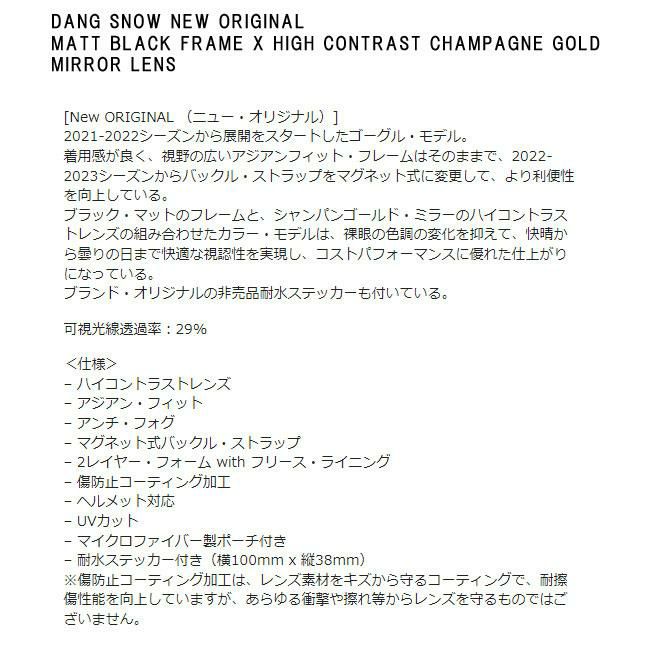 ゴーグル DANG SNOW GOGGLE New ORIGINAL Matt Black Frame x High Contrast Champagne Gold Mirror 23-24 ダン・シェイディーズ スノーボード スノボ