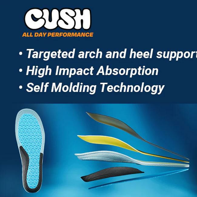 クッシュは、身体と関節のストレスを和らげ、体重や重い衝撃の影響を均等に分散させるために、生体力学的に設計された形状を採用しています。