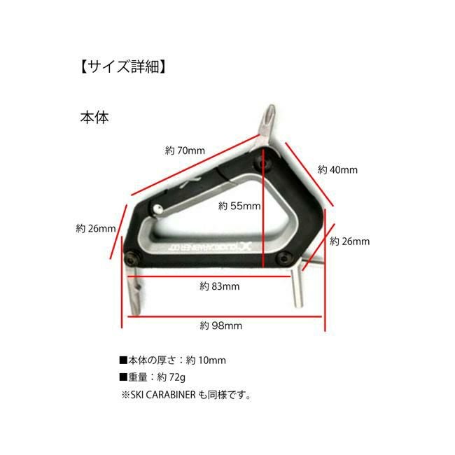 スキーカラビナは、マイナスドライバーとプラスドライバー、六角レンチの組み合わせだ。カラビナとしてバックパックに付けたり、