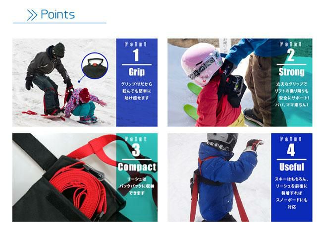 リーシュを収納する背負えるバックパックには、グリップが付いているので、リフトの乗降時にもお子様をしっかりとサポートできます。