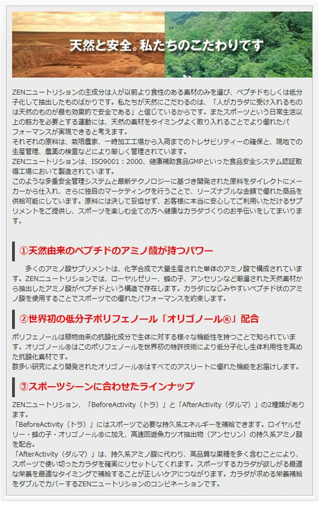 ロイヤルゼリー・蜂の子に加え、高速回遊魚カツオ抽出物(アンセリン)など、天然の持久系アミノ酸 を配合。さらに、これら天然由来のアミノ酸に運搬能力の優れた「オリゴノール」を加えることに より、カラダの隅々までアミノ酸を届けます。