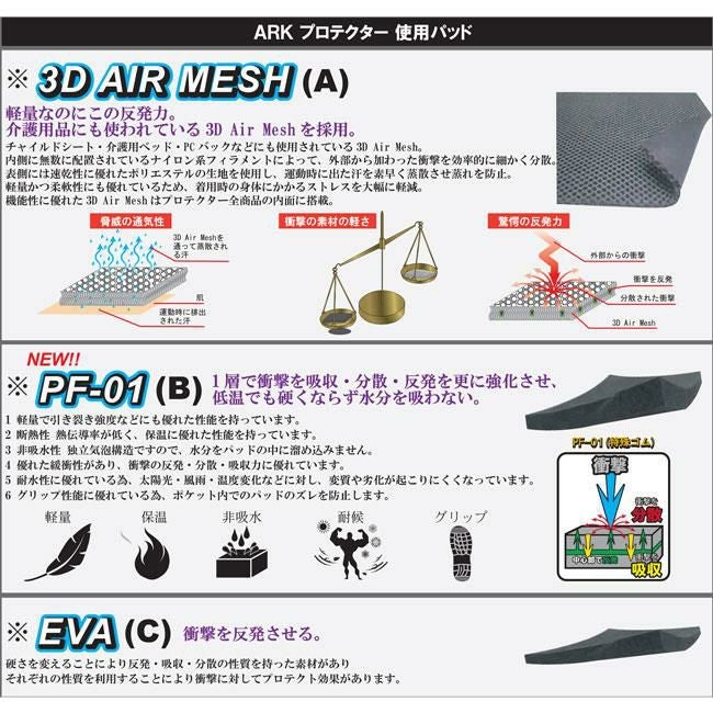 PF-01フォームや3D AIR MESH、XRDなど、ARK独自の衝撃吸収素材を搭載したアイテムを豊富にラインナップ。