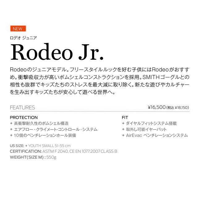 Rodeoのジュニアモデル。フリースタイルルックを好む子供にはRodeoがおすすめ。衝撃吸収力が高いボムシェルコンストラクションを採用。SMITHゴーグルとの相性も抜群でキッズたちのストレスを最大減に取り除く。新たな遊びやカルチャーを生み出すキッズたちが安心して遊べる世界へ。