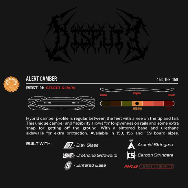 ▼ PUBLIC DISPUTEは、Ben Bilodeauのシグネチャーボードとして開発されたフリースタイルモデル。ディレクショナルツイン形状とAlert Camberプロファイルの組み合わせにより、弾むようなポップと高いコントロール性能を実現します。インレイ構造のアラミドストリップとカーボンストリンガーが軽量でパワフルな反発力を生み出し、レール、ジャンプ、パークライディングまで幅広いシーンで高いパフォーマンスを発揮。シンタードベースにより滑走性能も高く、スピードを求めるライダーにもおすすめの1本です。
