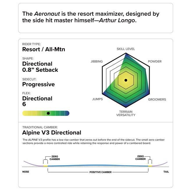 CAPITA AERONAUT(エアロノート)は、Arthur Longoのライディングスタイルを具現化した高速フリーランモデル。伝統的キャンバーをベースに、圧倒的な加速力と安定感を追求。リゾートを全開で滑りたいライダーに向けた、攻めの一本です。