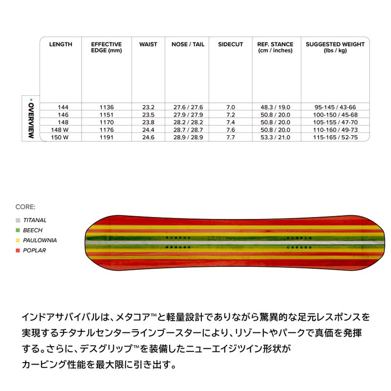 ▼ CAPITA INDOOR SURVIVALは、パークとリゾートを中心に高い操作性と反発力を発揮するフリースタイルボード。独創的なアートワークと、扱いやすさを重視した設計により、ジャンプ・ジブ・カービングまで幅広く対応します。「何でもできるフリースタイルボード」を求めるライダーに向けた、完成度の高い一本です。正規取扱店GOLGODAが自信を持っておすすめします。