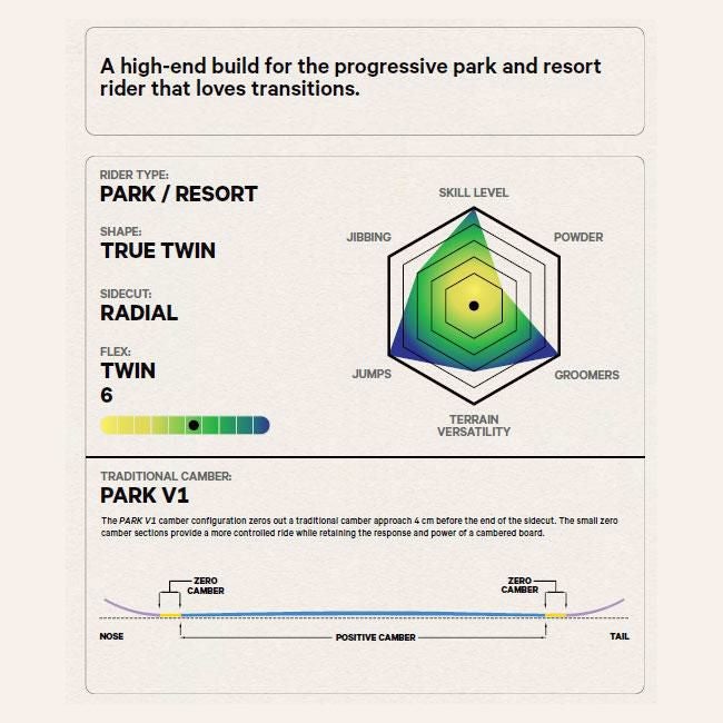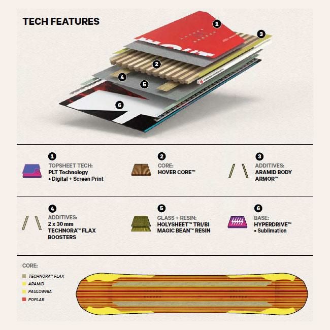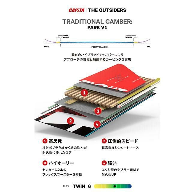 テクノラという新たな補強素材と、キャンバー特有の反発力とパワーにより高速安定性が非常に良く、大きなキッカーでも気持ち良く安全にメイクできる。