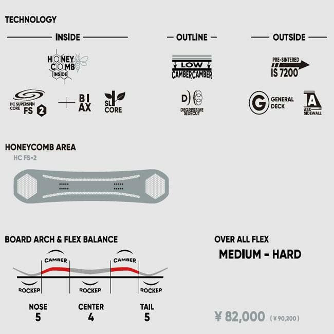 さらに、板を立てるとノーズとテールの有効エッチの極まで雪面に食いつきハードバーンでも満足できるカーリング性能を発揮してくれます。乗り方次第でカービングもトリックも楽しむことができるニューコンセプトボードがANDです。