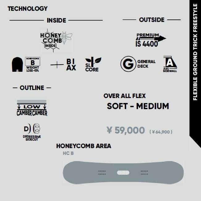 このキャンバー形状により程良いズラしやすさがスピード調整を容易にし、なおかつキャンバーのグリップカでターンのやりやすさを両立しています。