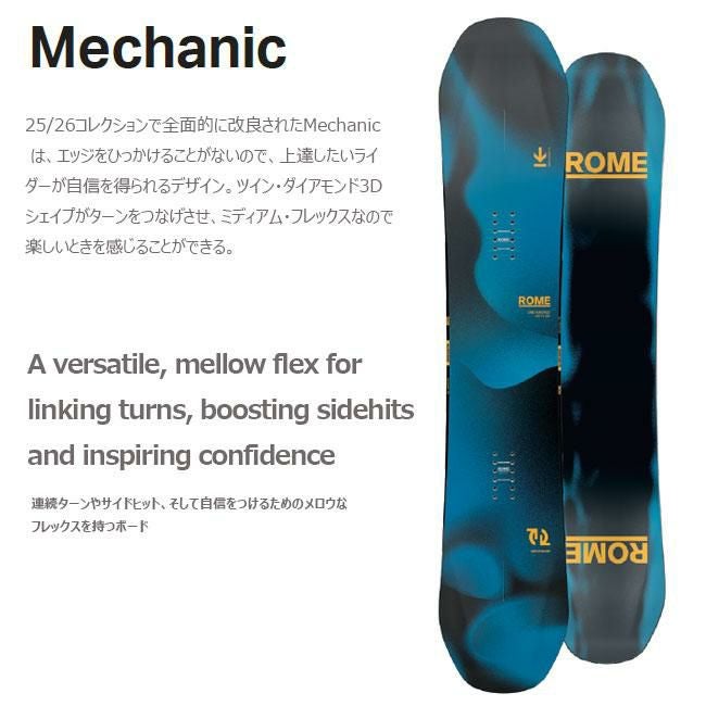 ROME MECHANIC ローム メカニック スノーボード フリースタイル 初心者 ビギナー 初級者 フラットロッカー ツインシェイプ グラトリ ジブ スイッチライド バター Pop Core 軽量 やわらかめ 安定感 成長モデル 2025-2026モデル