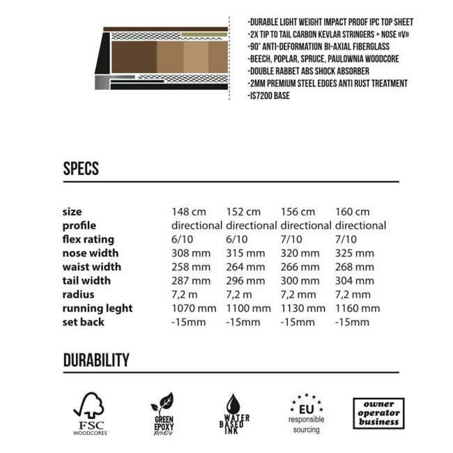 しかしピステンバーンでも楽しく乗れるようにするために強力なエッジグリップのために比較的短いサイドカットに設計されています。