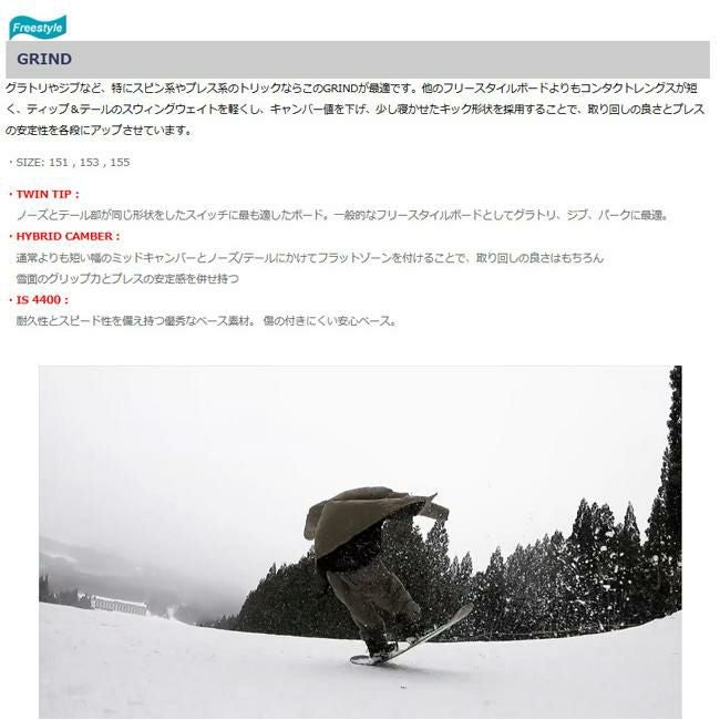 グラトリやジブなど、特にスピン系やプレス系のトリックならこのGRINDが最適です。他のフリースタイルボードよりも コンタクトレングスが短く、ティップ&テールのスウィングウェイトを軽くし、キャンバー値を下げ、少し寝かせたキック形状を 採用することで、取り回しの良さとプレスの安定性を各段にアップさせています。