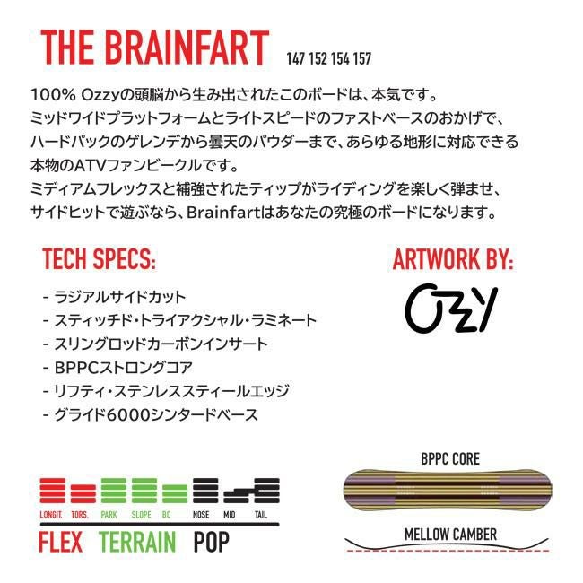 ミディアムフレックスと補強されたティップがライディングを楽しく弾ませ、サイドヒットで遊ぶなら、Brainfartはあなたの究極のボードになります。