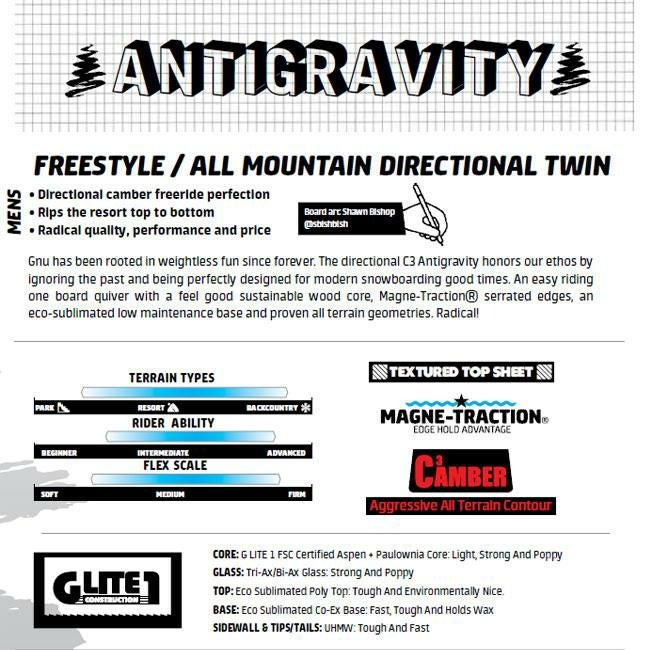 GNUは創設当初から無重力の楽しさをルーツにしてきました。ディレクショナルなC3のANTIGRAVITYはそんな私たちの倫理を尊重し現代のテクノロジーでデザインされてます。ミッドフレックスでサスティナブルなウッドコア、Magne-tractionエッジ、C3キャンバーは純粋なフリーライドを楽しむために取り込まれています。ぜひ一度立ち止まってスノーボードの楽しさを再構築しましょう。