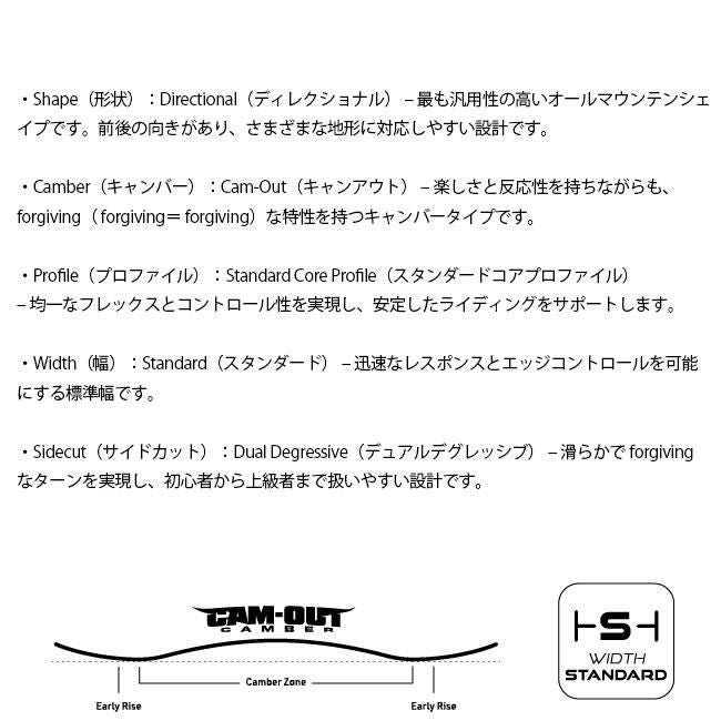 扱いやすいミディアムフレックスと、雪質を問わず安定感を発揮するCam-Outキャンバー構造が、サイドヒットやツリーラン、圧雪バーンなど、あらゆるシーンで自然な操作性を提供。