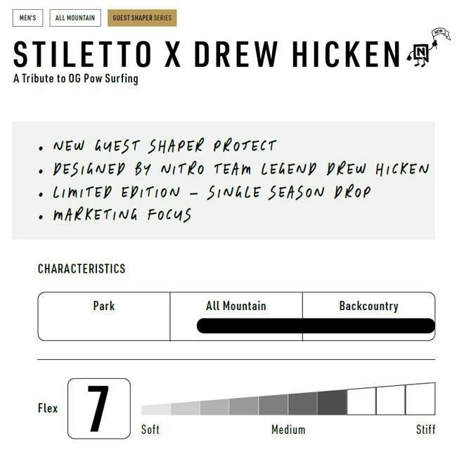 NITRO STILETTO X DREW HICKENは、OGプロライダーであるDrew Hicken(ドリュー・ヒッケン)による初のゲストシェイパーモデル。