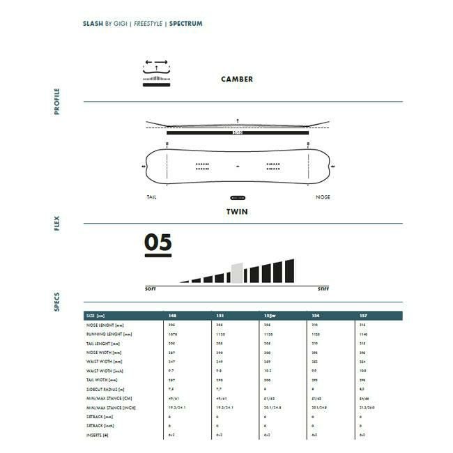ポジティブキャンバーと足元のカーボン・ファイバー・ストリンガーのカーボンボン・レイアップの組み合わせは、オーリーで反発力を発揮し、コントロール性を高めますが、剛性は6/10となっており、ジバーの最良の友として、遊び心のあるフレックスプレスを可能にしています。
