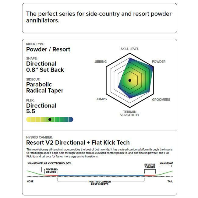 パウダーライディングを楽しむためにデザインされたパウダーフリースタイルボード。