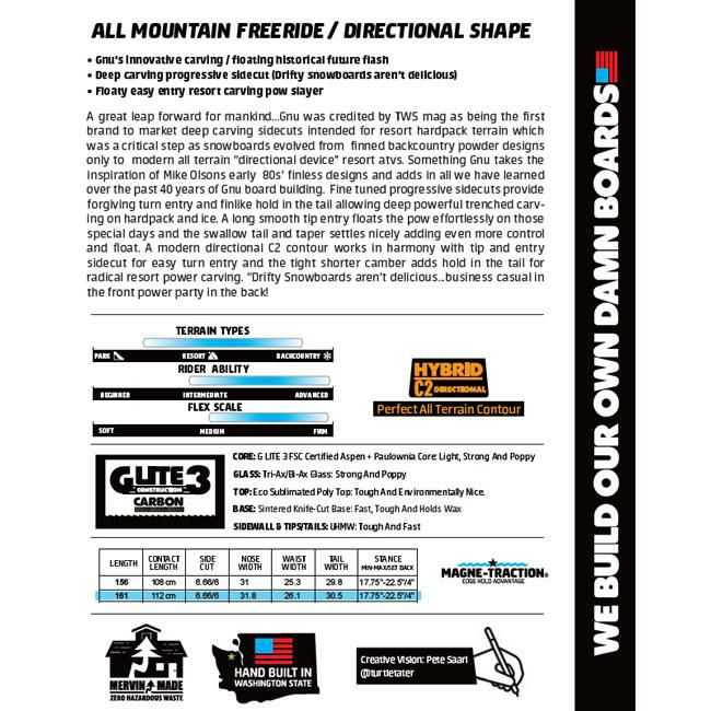 人類の偉大な飛躍、GNUはリゾートのハードパック地形を想定したディープカービングサイドカットを発売した最初のブランドとしてTWS誌に掲載されました。これはスノーボードがフィン付きのバックカントリー用パウダーデザインから、現代のオールテレイン用"ディレクショナル・デバイス"へと進化していく中で、重要なステップだった。このボードはマイク・オルソンによる80年代初期のフィンレスデザインからインスピレーションを受け作られ、微調整されたプログレッシブサイドカットはテールがフィンのようにホールド感があり、パワフルなトレンチカービングを可能にします。長いスムースなティップエントリーはスペシャルなパウダーを難なく浮かし、スワローテールとテーパーはコントロール性と浮力を更に高めます。