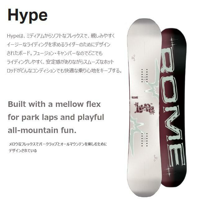 ROME HYPE ローム ハイプ スノーボード レディース 女性用 初心者 ビギナー 初級者 ツインシェイプ フリースタイル フラットロッカー やわらかめ 軽量 Pop Core グラトリ ジブ 地形遊び スイッチライド 2025-2026モデル
