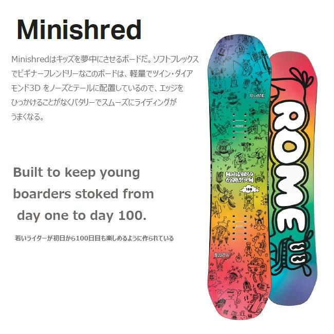 ROME MINISHRED ローム ミニシュレッド キッズ 子供用 スノーボード ジュニア ツインシェイプ フリースタイル 初心者 ビギナー 入門モデル フラットロッカー 軽量設計 やわらかい 滑りやすい スイッチ練習 親子ライド 2025-2026モデル