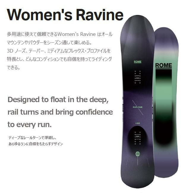 ROME WOMEN'S RAVINE ローム レディース ラヴィーン スノーボード 女性用 フリーライド パウダー 地形遊び ディレクショナル Free-The-Ride Camber ダイヤモンド3Dノーズ Pop Core Triaxグラス バイラディアルサイドカット 軽量モデル 中級者 上級者 2025-2026モデル