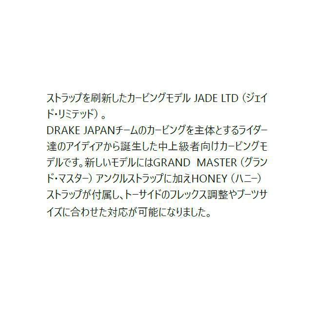 DRAKE JAPANチームカービングを主体とするライダー達のアイディアから誕生した中上級者向けカービングモデル。“SPEED & STYLE”をテーマにオリジナルデザインで登場。グランドマスター・ストラップを装備したスペシャルなモデルで、ノーマルストラップに比べブーツとの密着度が上がることでダイレクトなパワー伝達が可能。