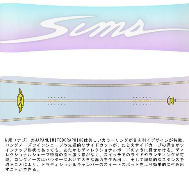 NUB(ナブ)のJAPANLIMITEDGRAPHICSは美しいカラーリングが目を引くデザインが特徴。ロングノーズツインシェープや先進的なサイドカットが、たとえサイドカーブの深さがツインチップ形状であっても、あたかもディレクショナルボードのように見せかける。ディレクショナルシェープ特有の引っ張り感がなく、スイッチでのライドやランディングが可能。ロングノーズはパウダーにおいて大きな浮力を生み出し、そして理想的なスタンスを取ることにより、トラディショナルキャンバーのスイートスポットをより効果的に生み出すことができる。