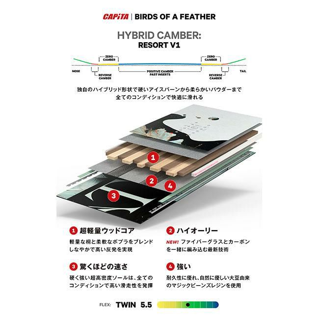 メンズDOAと全く同じ構造の次世代ハイブリッドキャンバー搭載のフリースタイルボードは、CAPiTAレディースモデルの中でも人気NO.1モデル。