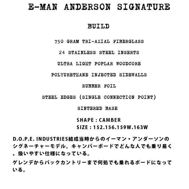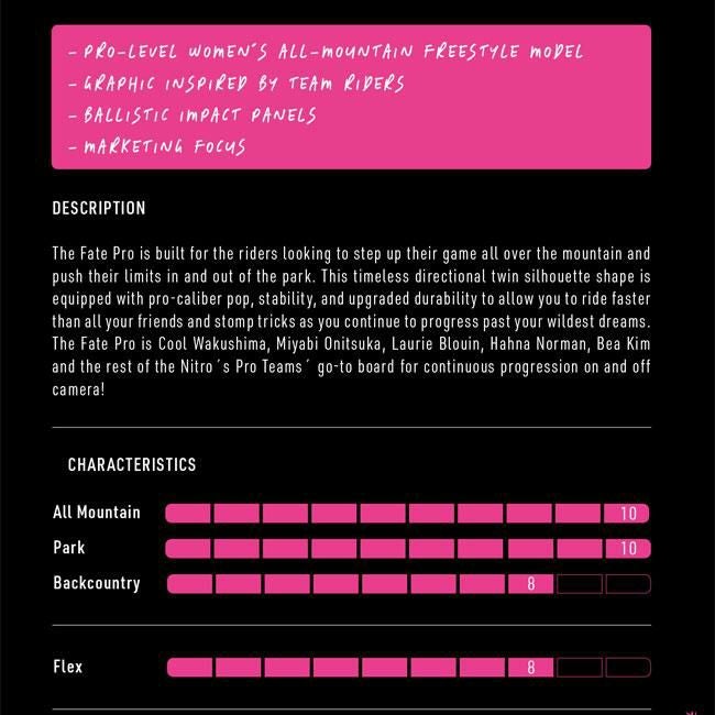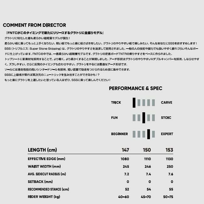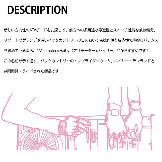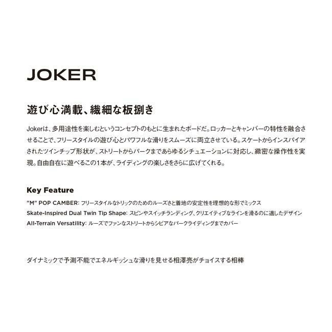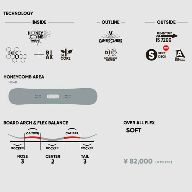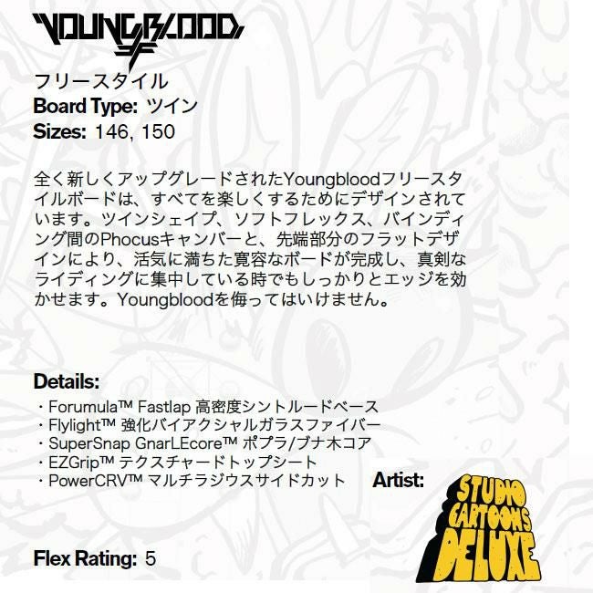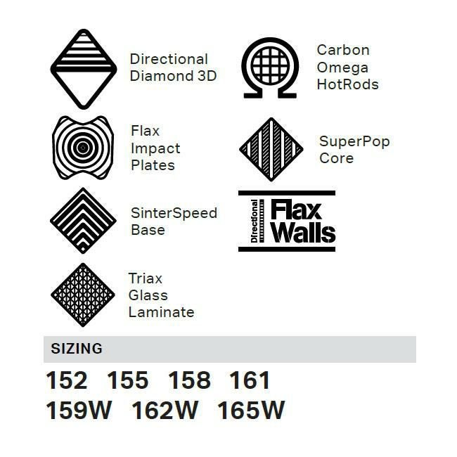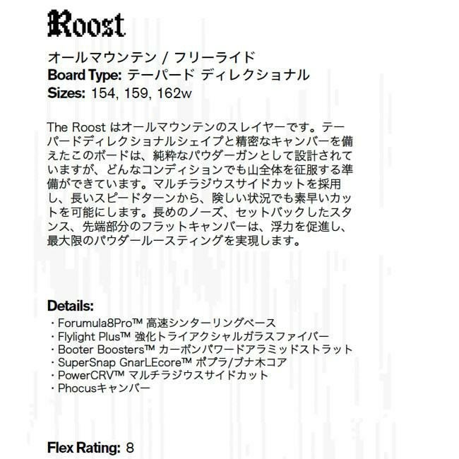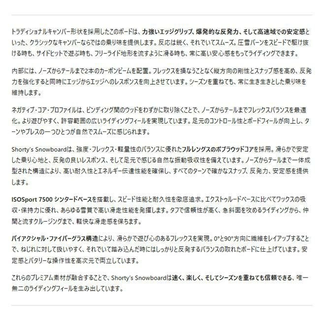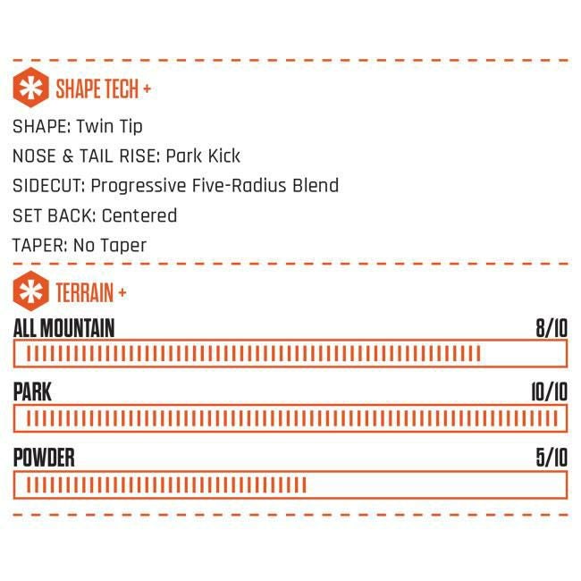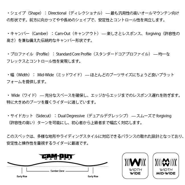 ハーフパイプなどのトリックやジャンプを主に楽しむ人向けの板です。軽量で遊びやすいフレックスが特徴です。