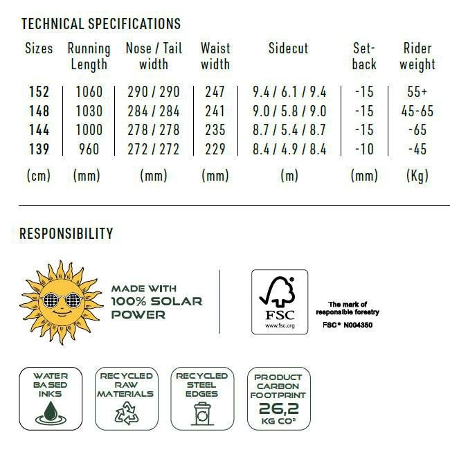 形状:ツインチップ(ノーズとテールが同じ形状)、ディレクショナル(テールがノーズよりも硬い)、ディレクショナルツイン(ツインチップの形状でがディレクショナルな性能)など。