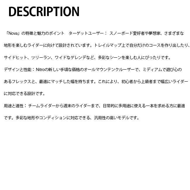フレックス:柔軟性や硬さ。フリースタイル向けは柔らかめで、フリーライド向けは硬めが一般的です。