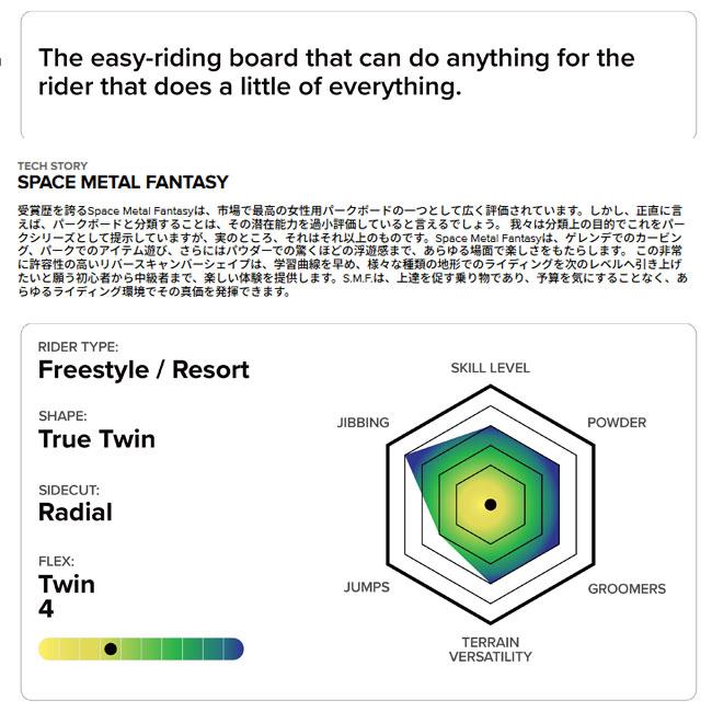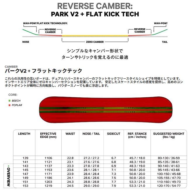 フリースタイル:パーク ジブグラトリ、 ハーフパイプなどのトリックやジャンプを主に楽しむ人向けの板です。軽量で遊びやすいフレックスが特徴です。