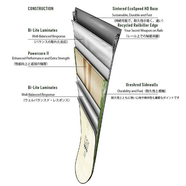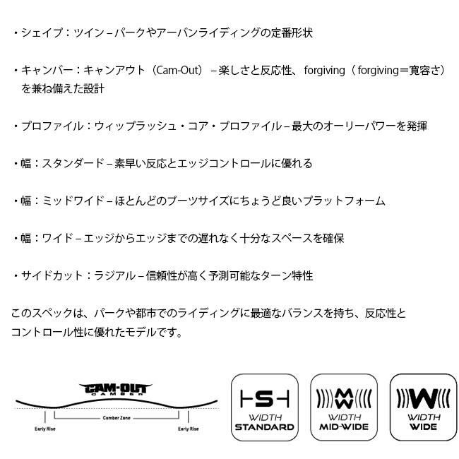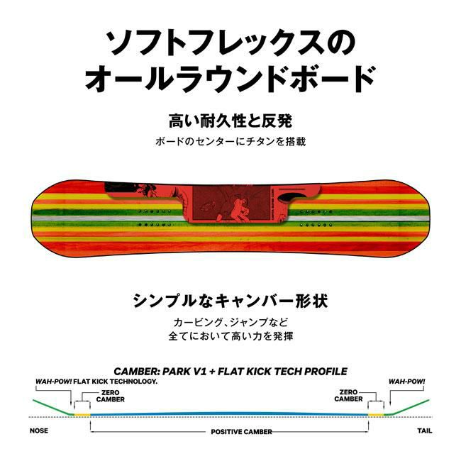 フリースタイル:パークや ジブ、グラトリ、 ハーフパイプなどのトリックやジャンプを主に楽しむ人向けの板です。軽量で遊びやすいフレックスが特徴です。