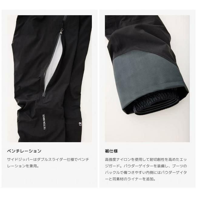 膝の立体裁断やエッジガード、パウダーゲイターのようなディテールはTB PANTやCLIMATIC BIB PANT と共通。