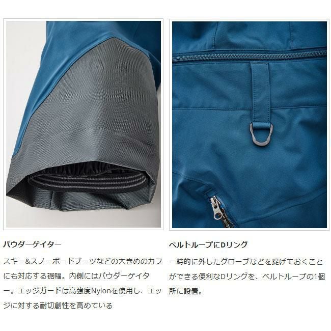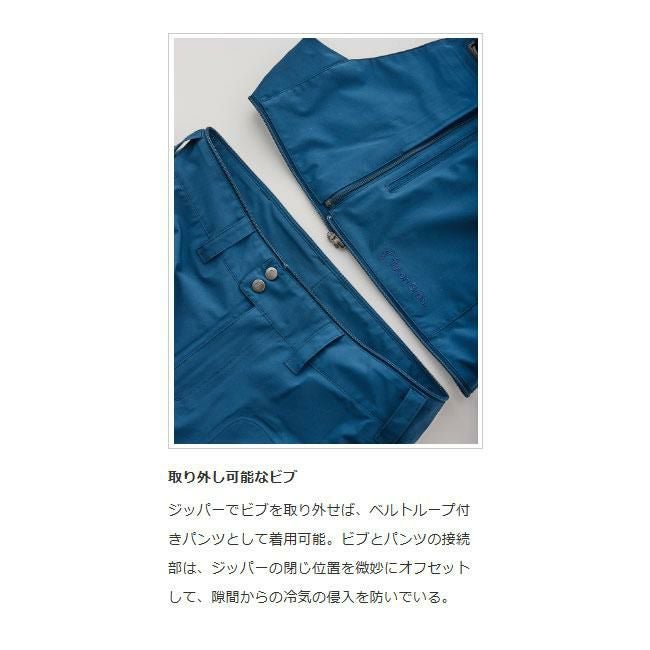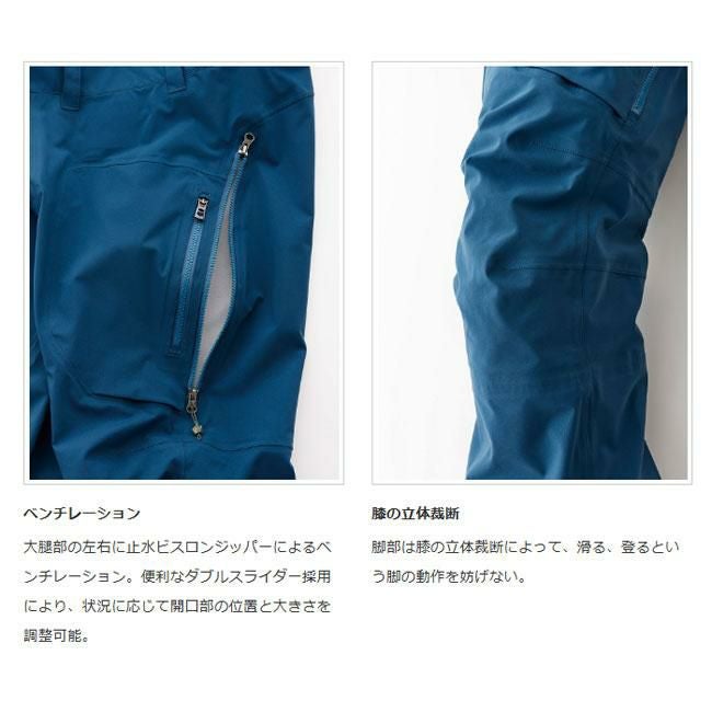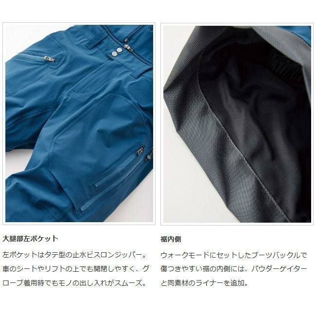 TB JACKETと共に、長年、雪山のさまざまなシーンで活躍しているフラッグシップのビブパンツ。太すぎず細すぎないシルエットに加え、長年微調整を繰り返したカッティングは完成の域。生地の伸縮性も相まって、登りでも滑りでも動きを妨げません。大きく開くサイドベンチレーションは開閉もスムーズで、行動中に素早くクールダウンが可能。大腿部左右には大型ポケット。今季、右ポケット内にデジタルデバイスを縦にホールドできるインナーポケットを取り付けました。裾のエッジガードは高強度ナイロンを使用。ハイク時にブーツバックルが干渉しやすかった内側にはパウダーゲイターと同素材のライナーを追加しています。ジッパーでビブを取り外せばパンツとしても使用可能です。