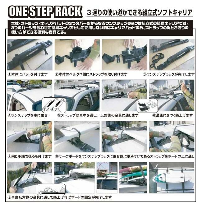 本体、ストラップ、キャリアパッドの3つのパーツからなるワンステップラッは組立式の簡易キャリア。