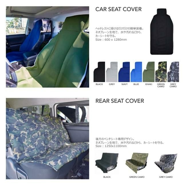 ■素材(ネオプレーン)を使用しクッション性や、断熱性に優れ、又裏側は、スキンゴムで滑りにくく、水分のしみ込みを確実に押さえ丈夫に出来ております。写真は4WDですが、軽~アメリカン4WDの大型車までフルカバー致します。ジェットやウェイクボード,水上スキー、ダイビング、サーフィン、ボディボード、スキー、スノーボード、バスフィッシングのウェーダ―、フローター等水遊び後の濡れた身体のままシートを濡らす事を気にせず乗車出来ます。その他汚れた服での乗車等、色々と使い道は、多いと思います。商品の取り付けは、座席のヘッドレストに掛けるだけの簡単装着タイプです。
