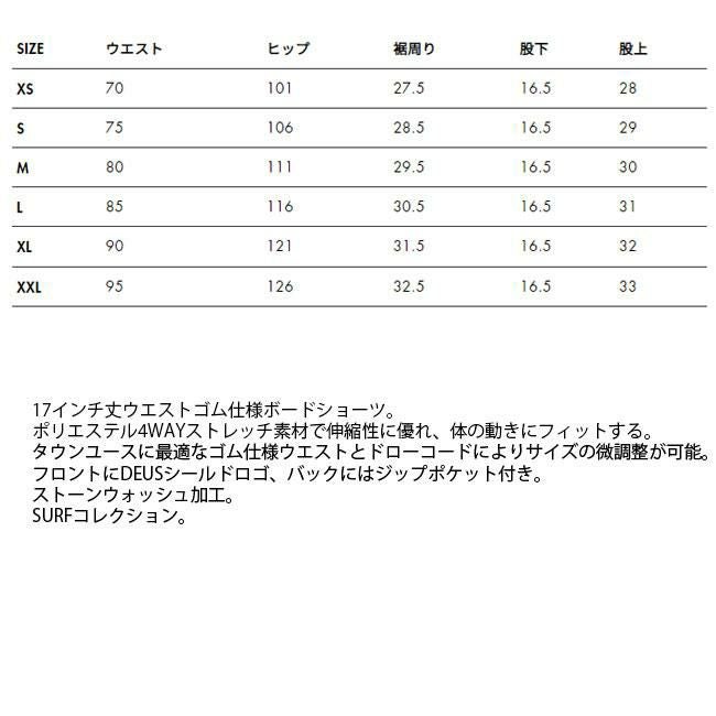 17インチ丈ウエストゴム仕様ボードショーツ。ポリエステル4WAYストレッチ素材で伸縮性に優れ、体の動きにフィットする。タウンユースに最適なゴム仕様ウエストとドローコードによりサイズの微調整が可能。フロントにDEUSシールドロゴ、バックにはジップポケット付き。ストーンウォッシュ加工。SURFコレクション。