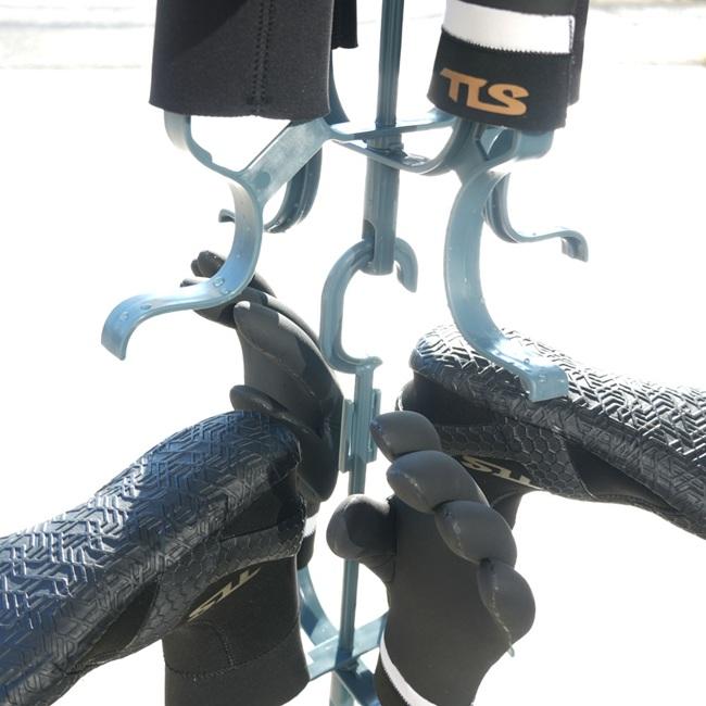 冬サーフィンの必需品であるサーフブーツやグローブなどの小物を干すことができるハンガー。