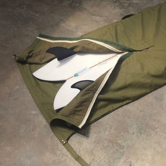 デュラブルな素材のザックリとした風合いで、手荒に扱える帆布サーフボードソックはフィンを付けたままでもボードを入れられるベルクロ付きフィンスロット付き。