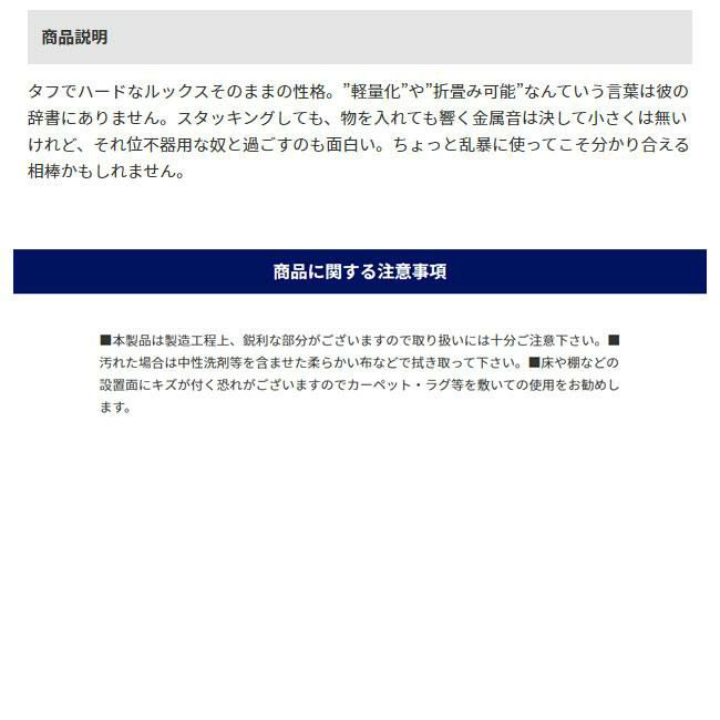 タフでハードなルックスそのままの性格。”軽量化”や”折畳み可能”なんていう言葉は彼の辞書にありません。スタッキングしても、物を入れても響く金属音は決して小さくは無いけれど、それ位不器用な奴と過ごすのも面白い。ちょっと乱暴に使ってこそ分かり合える相棒かもしれません。