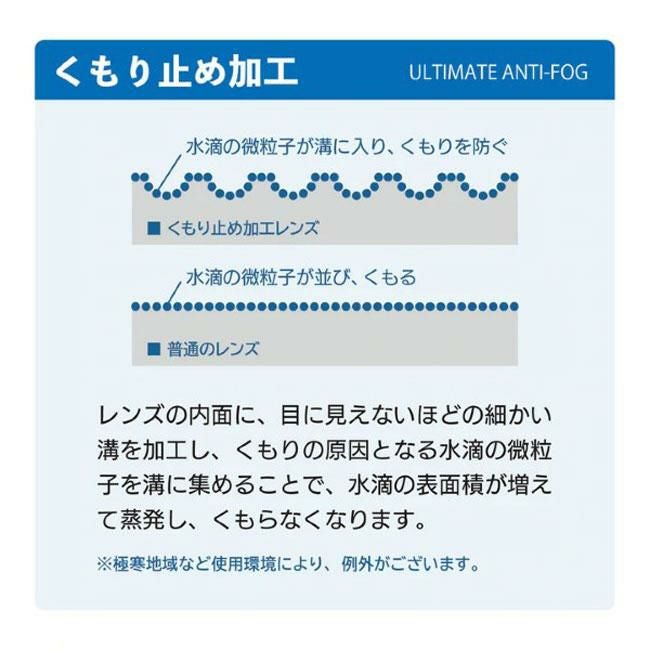 本製品は、レンズ内側に目に見えない特殊エンボス加工を施しており、レンズ拭き回数の影響無く半永久的に曇り止め効果が継続する、JIS規格のテストも適合した特別なレンズを使用しています。