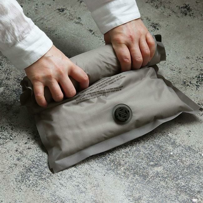袋の上部をスライダーで閉じ、手で袋を丸めて中の空気をロック式排気弁から排出することで圧縮が完了します。