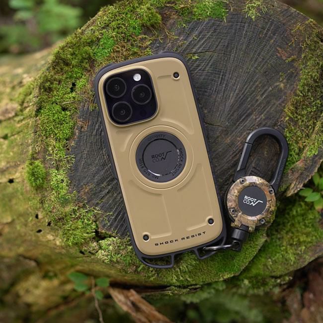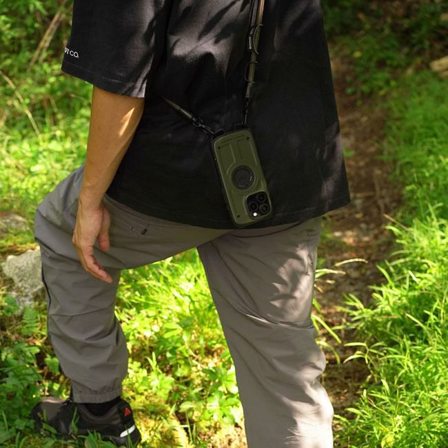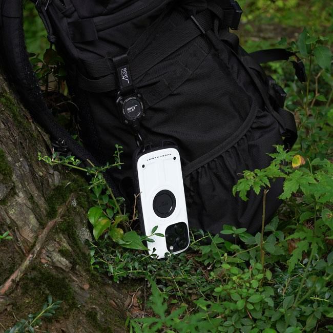 米国環境耐性試験「MIL-STD-810G516.6Procedure」の耐衝撃試験に準拠した耐衝撃性能はもちろん、下部に搭載されたカラビナループにはカラビナなどを直接ケースに取り付ける事ができるので、バックパックやショルダーバッグ・ベルトループ等にiPhoneをそのまま装着、登山やアウトドア時の落下防止が可能です。さらに、iPhone16シリーズ対応よりデザインをマイナーチェンジ。これによりケースを装着したままMagSafeアクセサリーの使用が可能となり、さらなる利便性を実現しました。登山やキャンプ・フィッシングなどアクティブなシーンで幅広く活躍します。