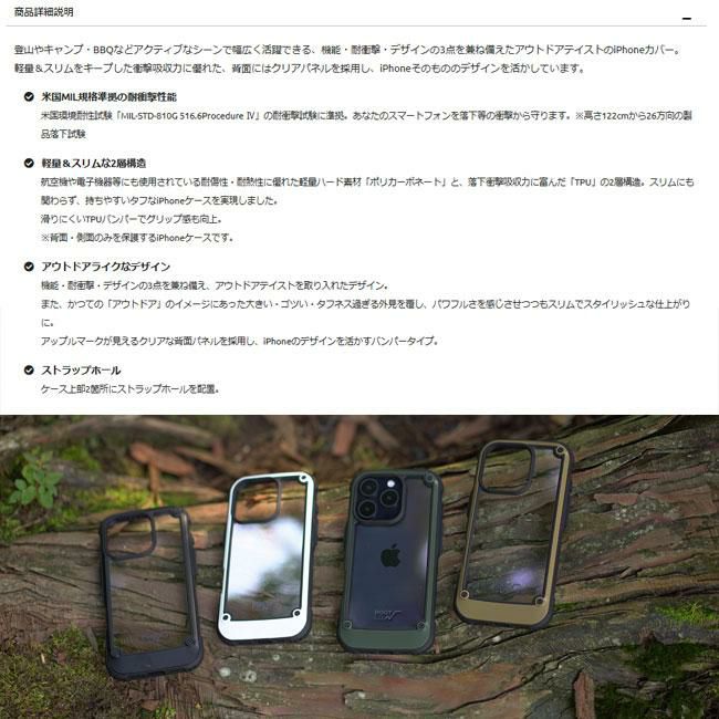 機能・耐衝撃・デザインの3点を兼ね備え、アウトドアテイストを取り入れたデザイン。 また、かつての「アウトドア」のイメージにあった大きい・ゴツい・タフネス過ぎる外見を覆し、パワフルさを感じさせつつもスリムでスタイリッシュな仕上がりに。 アップルマークが見えるクリアな背面パネルを採用し、iPhoneのデザインを活かすバンパータイプ。