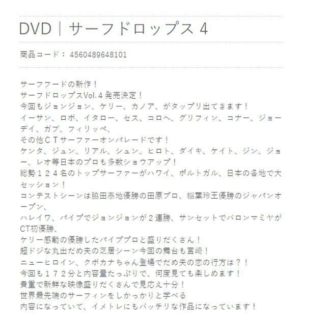 他の画像を見る 2本以上購入でさらに5%OFF サーフィン DVD サーフドロップス Vol.4 サーフフードの新シリーズ SURF DVD 春夏 秋冬 定価 ¥ 5,280 のところ 特別価格 ¥ 5,280 税込 カートに入れる お気に入りに登録する