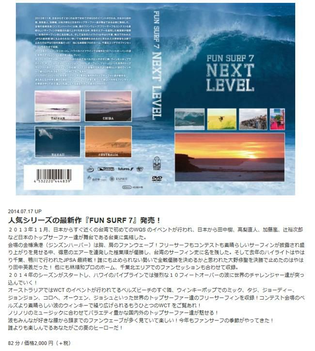 他の画像を見る 【送料無料】2本以上購入でさらに5%OFF 送料無料 10%OFF SURF DVD FUN SURF FUN SURF 7 NEXT LEVEL 人気シリーズの最新作 オススメサーフィンDVD 春夏 秋冬 定価 ¥ 2,200 のところ 特別価格 ¥ 1,980 税込 カートに入れる お気に入りに登録する